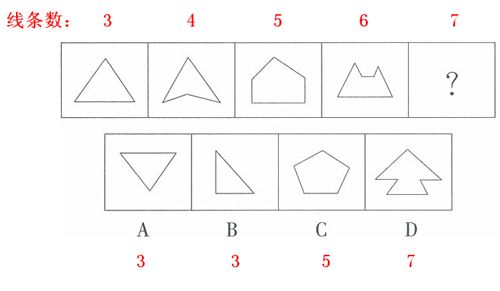 这道题属于数量类,主要考察图形的线条数量。图形的线条数依次为3、4、5、6,选项中只有D的线条数为7。