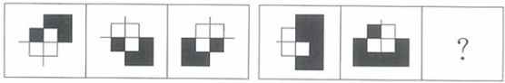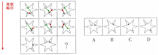 这道题属于位置类,主要考察图形的顺时针和逆时针旋转。外部阴影顺时针旋转90度,方块内的阴影逆时针移动一格,得到后面的图形。