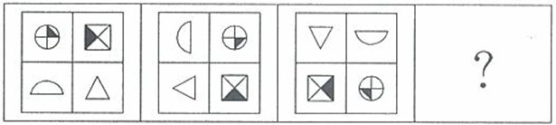 这道题属于位置类,主要考察图形的旋转中的顺时针+逆时针。四个图形元素依次顺时针移动一格,并且每次带阴影的圆形顺时针旋转90度,带阴影的方形、半圆形、三角形每次逆时针旋转90度.依此规律.选择B。