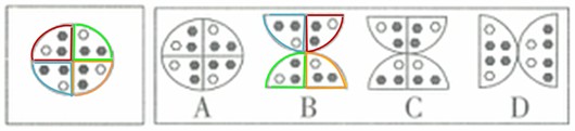 这道题属于样式类,主要考察图形的拆分重组。由原图可知,靠近直角的有2个黑球和2个白球,排除A、C、D;只有B项是由左边图形拼接而成的。
