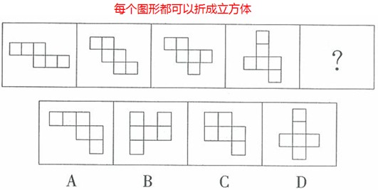 这道题属于结构类,主要考察图形的面的特征和细节。题干的每个图形都可以折成立方体,选项中只有D满足。