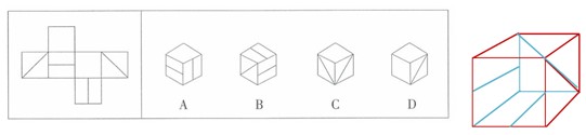 这道题属于结构类,主要考察立体图形的折叠。由原图可知,折起来后,两条对角线有一个交点,水平线与竖直线折起来后是平行的,可排除A、B项;两个空白面如D放置时,对角线的方向不对.C项正确.