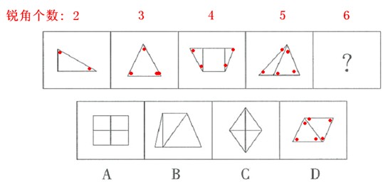 这道题属于数量类,主要考察图形的锐角数量。各图形中锐角的个数分别为2、3、4、5、(6)个,所以选择D。