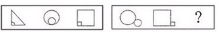 已知图形中包括三角形、圆形、正方形,且在其内部还分别有一个小图形,再看问题图形,已经包含了圆形、正方形,且在其外部还分别有一个小图形,故第三个图形应该是三角形,且其外部也应有一个小图形。故正确答案为C。