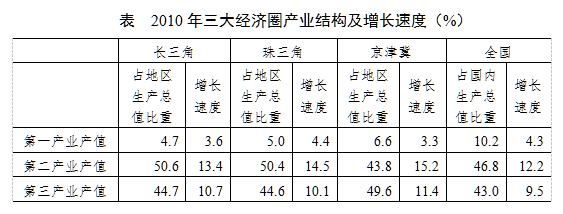 三大经济圈中,2010年三次产业增长速度均超过全国平均水平的有几个?