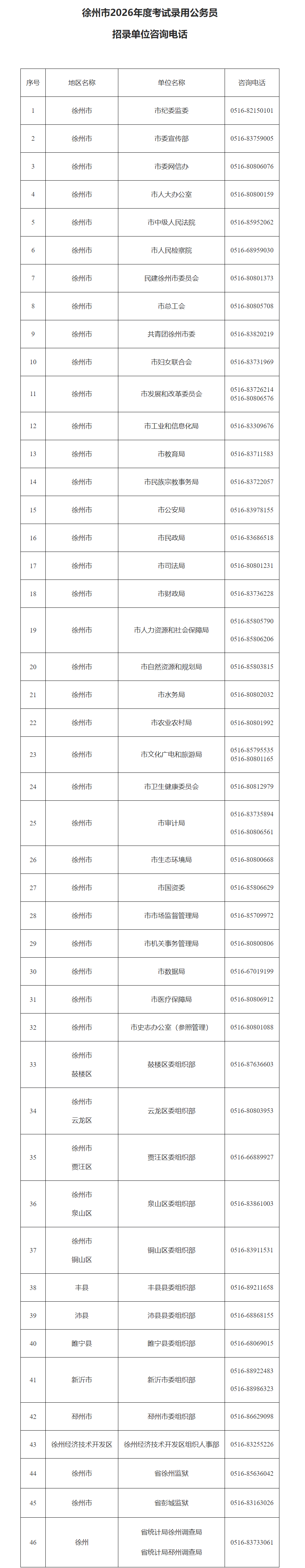 2.徐州市2026年度考试录用公务员招录单位咨询电话